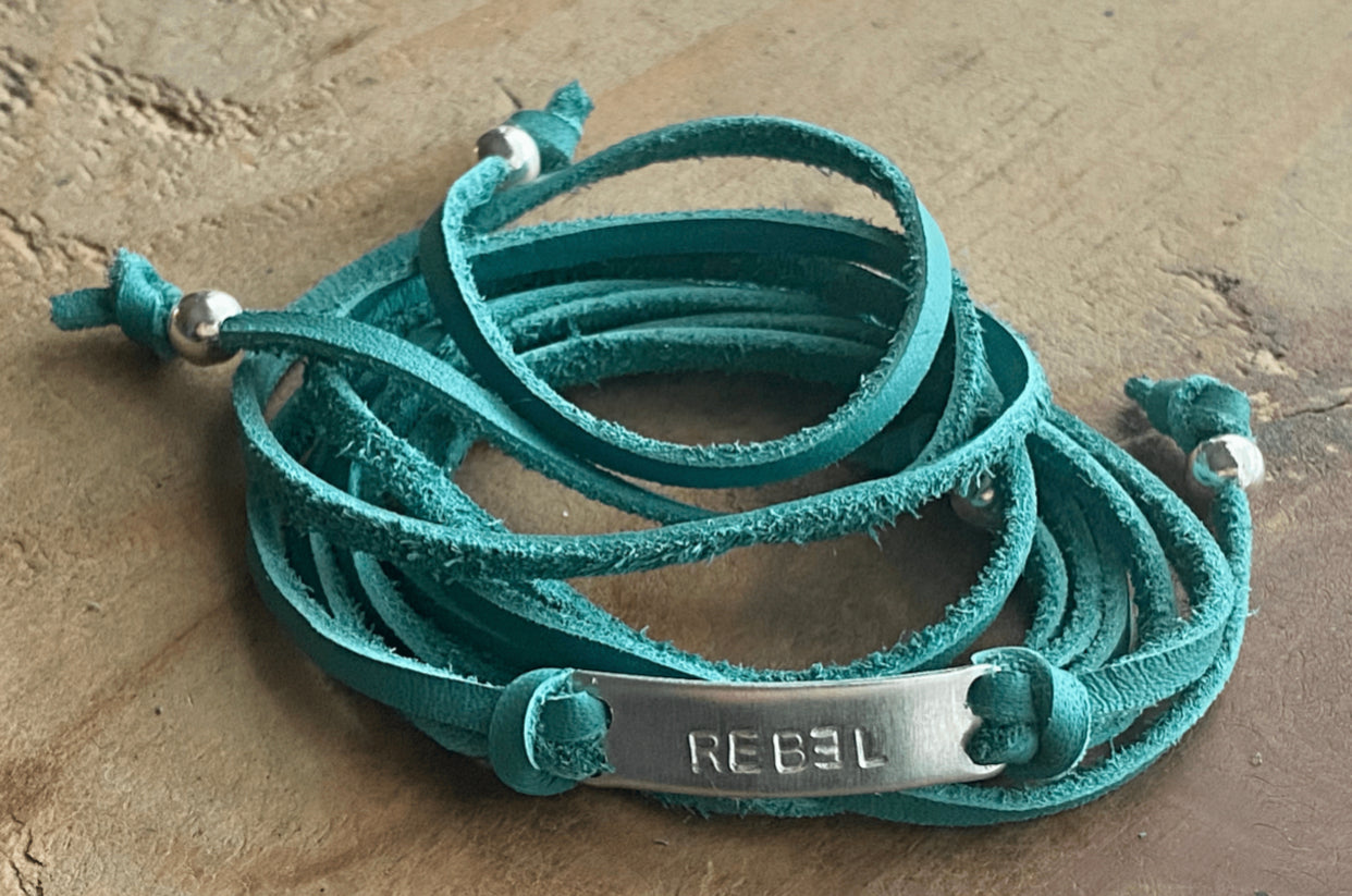 Teal leather wrap bracelet with brushed nickel embossed logo